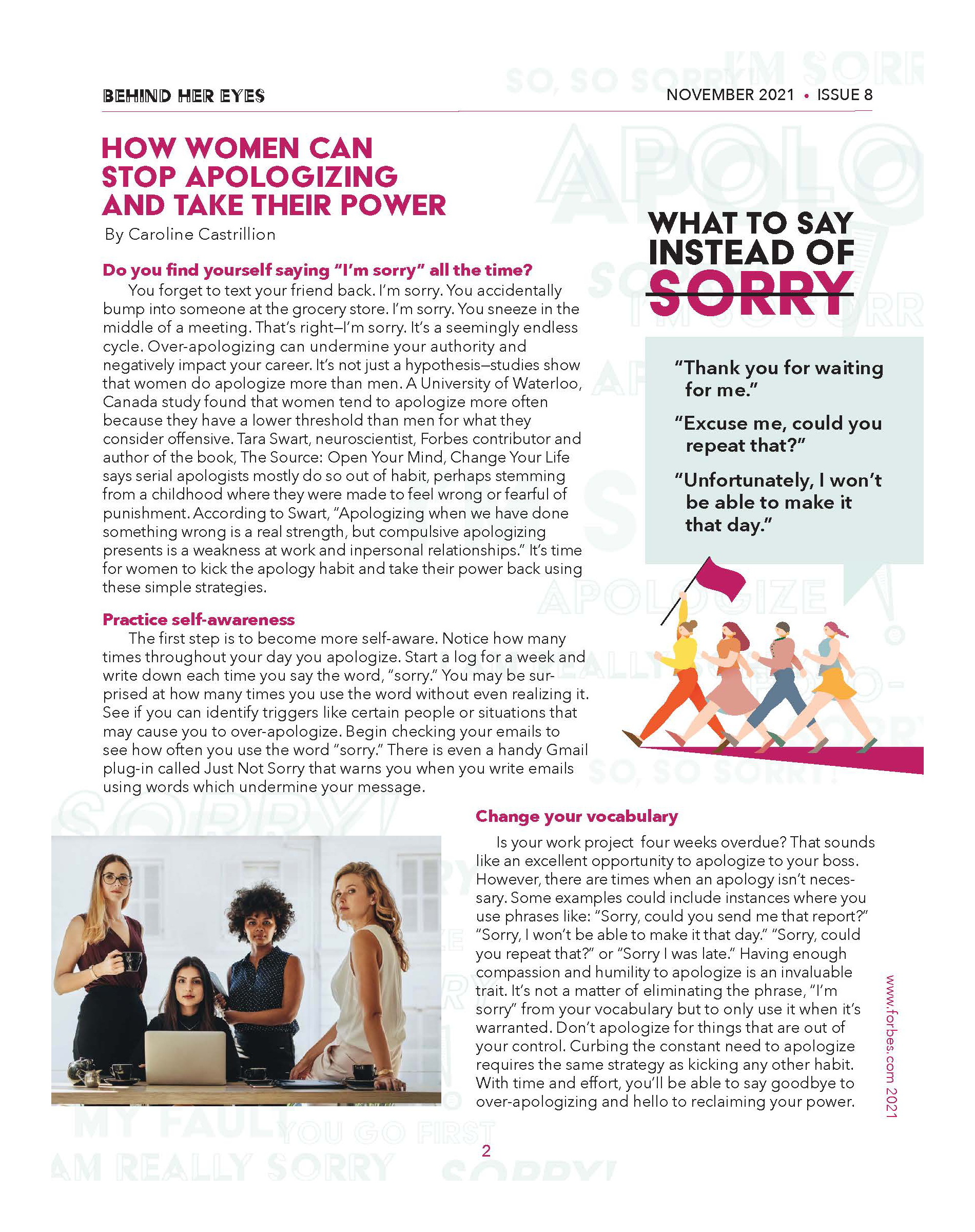 Behind Her Eyes is a newsletter I created to be viewed as an e-publication. This newsletter focuses on understanding and bettering life as a woman. As a member of the Body Positivity Club at Robbinsville High School, I’m constantly looking for ways to help girls struggling with the same body image issues I face. My goal was to create a platform where you can find that help without feeling ashamed. You can find articles about how to stop apologizing, and lists promoting body-positive women. I designed the pages to have a comforting “older-sister” essence, while also showing power through typography. Although not available through SlideRoom, when viewing as an ebook, I learned how to embed code to a video (as seen on page one). Overall, this newsletter showcases what I love and what I would like to continue promoting as a young woman in 2022.